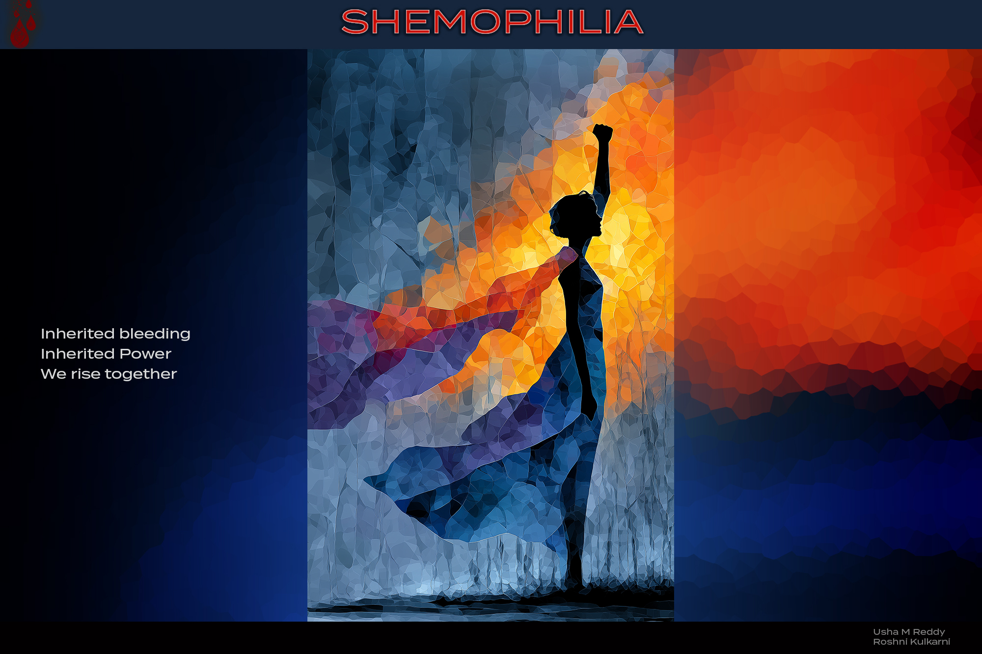 SHEMOPHILIA This image stands as a tribute to the women who live with inherited bleeding disorders — a group often unseen, yet profoundly resilient. The red sun holds a double helix and blood droplets, symbolizing the genetic legacy that shapes their lives. The figures below rise together, not in defiance, but in recognition: of their shared struggle, their inherited power, and their right to be visible. In a world where hemophilia is often spoken of as a male condition, this piece reframes the narrative. It centers the women whose DNA carries the mark of bleeding, and whose lives carry the weight — and the strength — of that truth. “SHEMOPHILIA” is not just a word. It’s a call to witness. To honor. To believe.