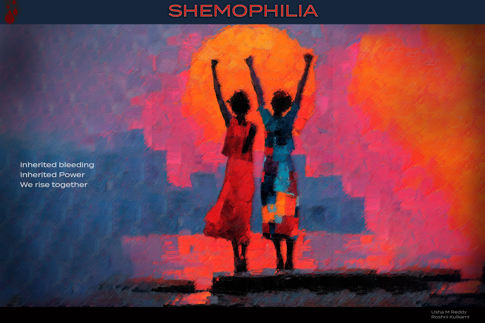 SHEMOPHILIA This image stands as a tribute to the women who live with inherited bleeding disorders — a group often unseen, yet profoundly resilient. The red sun holds a double helix and blood droplets, symbolizing the genetic legacy that shapes their lives. The figures below rise together, not in defiance, but in recognition: of their shared struggle, their inherited power, and their right to be visible. In a world where hemophilia is often spoken of as a male condition, this piece reframes the narrative. It centers the women whose DNA carries the mark of bleeding, and whose lives carry the weight — and the strength — of that truth. “SHEMOPHILIA” is not just a word. It’s a call to witness. To honor. To believe.